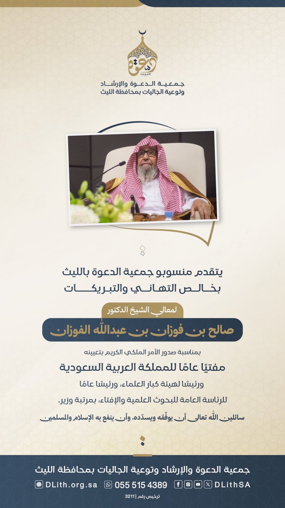 تهنئة، لمعالي الشيخ الدكتور: صالح بن فوزان الفوزان