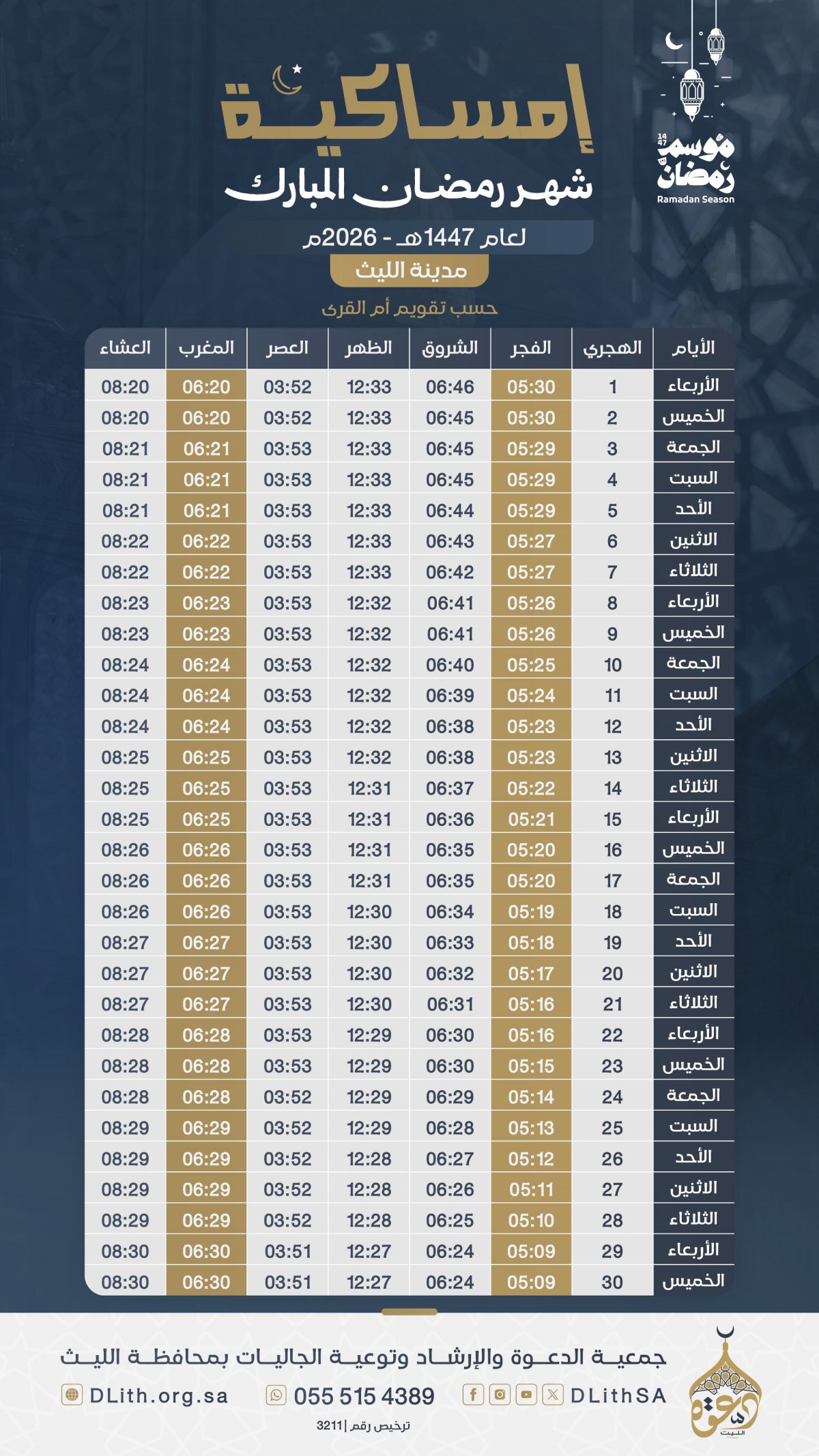 إمساكية شهر #رمضان المبارك لـ عام 1447هـ لـ #مدينة_الليث حسب تقويم أم القرى.